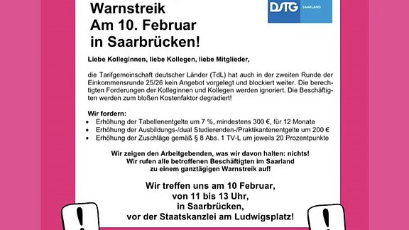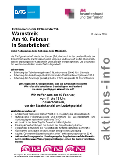 Der dbb ruft zum Warnstreik auf! Zur Kundgebung treffen wir uns am 10.02.2026 ab 11:30 Uhr in Saarbrücken vor der Staatskanzlei. SEI DABEI!