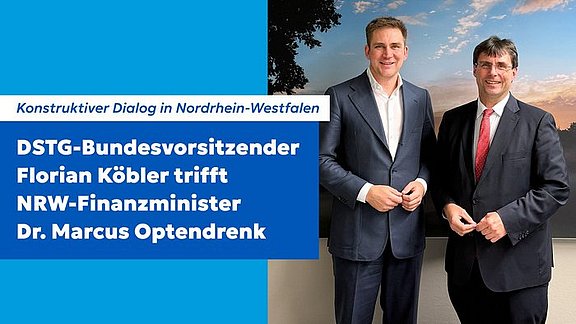 Der Bundesvorsitzende der Deutschen Steuer-Gewerkschaft (DSTG), Florian Köbler, hat ein äußerst konstruktives und vertrauensvolles Gespräch mit dem Finanzminister des Landes Nordrhein-Westfalen, Dr. Marcus Optendrenk, geführt. Im Zentrum des…