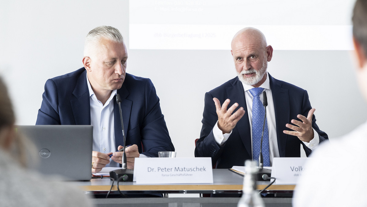 „Union und SPD müssen jetzt geschlossen auftreten und abliefern“, sagte der dbb Bundesvorsitzende Volker Geyer bei der Vorstellung der Ergebnisse am 3. September 2025. „Sie müssen die Dinge, die den Menschen wichtig sind und die ja teilweise auch bereits im Koalitionsvertrag vereinbart wurden, jetzt professionell abarbeiten. Wenn davon wieder nichts im Alltag der Menschen ankommt, folgt auf den ungebremsten Sinkflug des Vertrauens ein ganz harter Aufprall.“